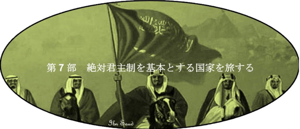 第7部: アラビア半島七ヵ国の住民、居住地や人口集中地、行政区画を説明し、現状眺めた上で、国家基本法を中心に政治体制を総括し、さらには、改めてアラビア半島七ヵ国を概観して、現在、各国が抱える社会問題について触れた「第7部 絶対君主制を基本とする国家を旅する」