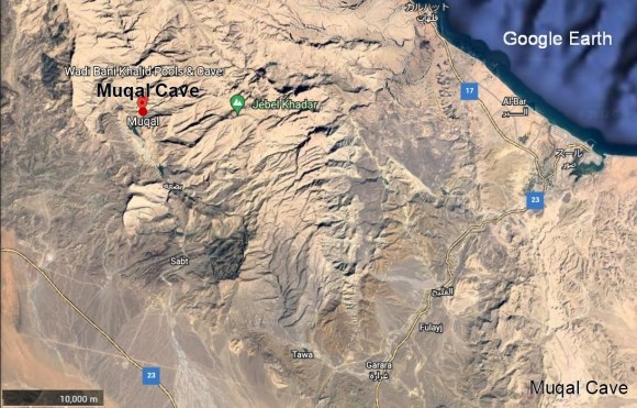 この洞窟は、ドファル県(Dhofar Governorate) のサラーラ(Salalah)から約40キロ離れたシャッティアルムグセイル地区(Shatti Al Mughsayl)にあります。アラビア海の波が水中から岩の空洞を抜けて吹きあがるアルムグサイの吹き抜け(Al Mughsay blow holes)を見下ろす崖の上です。吹き抜けて噴出する水の音が豪快に感じられます。