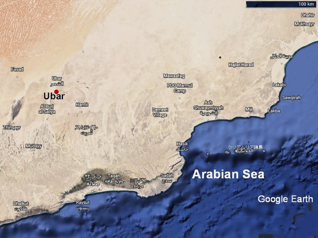 Ubarとは、旧約聖書に書かれている「千本柱の都市City of a Thousand Pillars、Iram of the Pillars or Wabar)」です。この都市はアラビア半島南部の空白地帯沙漠Rub al Khali Desertにありました。紀元前3000年から1世紀頃まで交易の中心として繁栄してながら、歴史の中に忽然として消えていまいました。そのため、「伝説の失われた都市」とも言われています。Qur’anでは「Noahの曾孫のアード Ad or A’adの一族が築いた町で、石の偶像神を崇拝する邪悪な人々が住んでいた。預言者Hudがこの町は頽廃され、繁栄を維持できなくなったことを警告した。アード (Ad)の息子で王であったシャッダド(Shaddad)は、これを無視し、反抗した。この為、神はこの町を滅ぼし、砂の中に埋めてしまわれた」と書かれているそうです。シャッダド(Shaddad)についての出来事はアラビアンナイト(Book of One Thousand and One Nights)の中でも語られています。この「伝説の失われた都市」を探す為に1980年代からナサの衛星写真(NASA Remote Sensing Images)等を使って乳香の道(Frankincense Route)を解析し、オマーン(Oman)のズファール地方(Dhofar)にこの「伝説の失われた都市」の所在の可能性を見出しました。1992年にラヌルフ・ファインズ(Ranulph Fiennes)、ジュリス・ザーリンス(Juris Zarins)等からなるアメリカ調査団がシスル(Ash Shisar or Ash Shisr)と云う泉の傍で、その水源となった鍾乳洞の中で、建造物を発見しました。ここは、16世紀にシス’ル砦(Shis’r)のあった場所で、300年から500年の間に大きな鍾乳洞陥没によって埋没していました。ここが、ほぼ、ウバール(Ubar)だと特定されています。