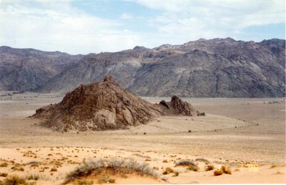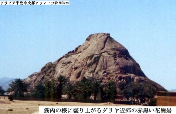 花崗岩地帯はアラビア楯状地の主要部を成し、緩やかに起伏していますが、場所によってハーイルのアジャー山塊の様に赤黒い大地が筋肉状の盛り上がりを見せています。花崗岩の山は、滑らかな山肌を残している赤黒部分、角が丸みを帯びた四角形に割れた暗い大石部分および更に小さな四角張った小石に割れて黒ずんだ黄土色に見える部分に、ほぼ3等分されます。