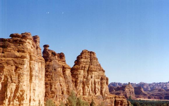 Steep red sandstone cliffs on either side of the Al Ula Valley, 380 km north of Madinah