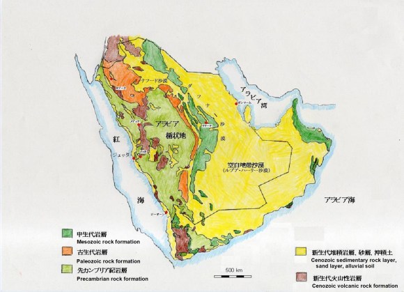 「アラビア半島の地形は、それぞれ景観に特徴のある火成岩系の花崗岩地帯と熔岩地帯、堆積岩系の砂岩地帯と石灰岩地帯および風成された砂丘地帯の5つの地帯に分けられる」と筆者は考えていいます。なお、変成岩は火成岩や堆積岩の一部として扱っい、地形用語としての「アラビア楯状地」は、その地上に露出している中央部および西部を指しています。