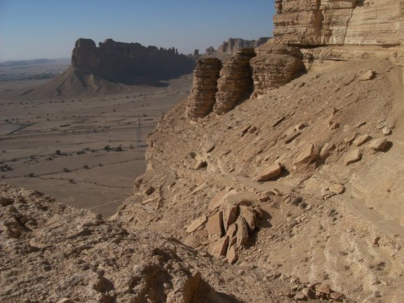 石灰岩地帯は半島の北部や東部を被い、飽きるほど果てしない広がりに特徴があります。内部は鍾乳洞が発達して大きな地下空間があります。しかし、地表部分は一般的に単調と云えるほど平な大地になっています。スンマーン台地やトゥワイク山脈の様な石灰岩の絶壁は、砂岩の絶壁より多少は丸みを持ちますが、西部劇にでも登場するような平頂山も形成します。その様な例はリヤードの近郊にも「世界の果て」、「ファイサル尖塔」、「第一駱駝の切り通し(キャメルパス)」等と名づけられている景観があります。