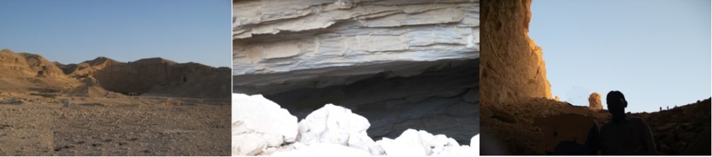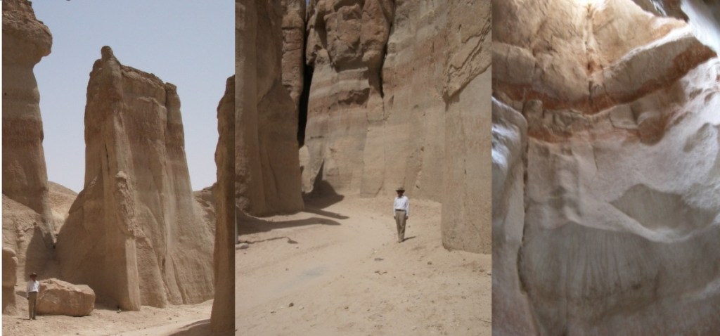 ハサー・オアシス(Al-Hasa Oasis)フフーフ(Hofuf)東10km付近の砂岩の岩山にある特異な横穴洞窟です。麓一面には広大なナツメヤシ園が広がっています。これらの横穴洞窟は、降った雨が、砂岩層を侵食して、茸型の岩を幾つも作り、それらを繋げて、谷間を作ってゆく過程ではないかと、筆者は思っています。もう一つの要因は、蒸発岩の存在です。蒸発岩は、岩塩、石膏、霰石等で構成され、挟みの様に砂岩層の一部となっています。その部分が水に溶かされ、空隙となっている場所を見ることもあるので、それが洞窟化を促進させるのだと思います。この洞窟を最初に訪れた時は、最初の階段を登って、暫く行った二股の天井は高いけれど狭い狭い大人一人横になってやっと通りられる洞窟のその先で人が昼寝していた空間がありました。その後に洞窟内の崩落があり、そこまで、奥まで入れませんでしたし、洞内を多少は照らしていた電球も消されていました。このため、狭いところでは足下が見えず、採光はずーと高いところにある自然の裂け目からの漏れてくる光だけでした。