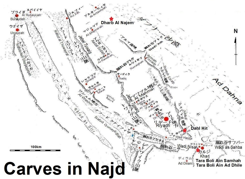 ジョン・パイン博士(Dr. Jon Pint)は、ARAMCOの地質屋から「マジュマア(Al Majma’ah)近くに「星の落ちた穴(the place of the fallen star)」と呼ばれる巨大な竪穴がある」と聞き、1985年ダーラン(Dhahran)の石油鉱物大学(現在のKFUPM)で英語教師をして、週末に洞窟探しをしていた同博士は、スサナ・イバラ(Susana Ibarra)を伴い、友人とマジュマア(Al Majma’ah)に向かい、同地域出身の学生とその紹介のガイドを伴って、「星の落ちた巨大な穴(the place of the fallen star)」に向かいました。マジュマア(Al Majma’ah)から30キロ離れた、ウム・エル・ラドゥーマ地層(Umm al-Radhumah Formation)が断崖となっている崖地(escarpment)の近くで、巨大な四角いクレタ―を見つけました。その墨のような暗黒にロープで使って懸垂下降しました。100メートル下降したところでクレーターの底に辿り着きました。見上げると、降り口だった小さな四角の隙間から、光が差し込み、直径が100メートルに及ぶ、丸天井を持つ、大きなドームの底に降り立ったことが分かりました。これがナジェム(Dharb Al Najem)の発見でした。見上げると、次に下降中の友人は、蟻の大きさにしか見えませんでした。現地の人達は、こからハサー・オアシス(Al Hasa Oasisi)のホフーフ(Hofuf)まで地下水路で川が流れている。」と、話してましたが、その様な大きな水平トンネルはおろか、周囲の亀裂(cracks)を何度も覗き込みましたが、脇道の兆候(signs of a side passage)は発見できず、「ナジェム(Dharb Al Najem)は、独立した大きなドーム型の部屋である」と、ジョン・パイン博士(Dr. Jon Pint)は結論付けています。同博士は、この探索について、さまざまな発表してますが、所在については、明確に述べた記事はありません。私は、同博士の記述からジュバイル崖地から北北西へ’アルマ崖地へと続き、さらに北へ延長して来ている崖地の西側だと考えています。また、ナジェム(Dharb Al Najem)は、鍾乳洞と一応考えていますが、ジョン・パイン博士(Dr. Jon Pint)の「水平トンネルが無いとすると、この穴はどのようにして形成されたのでしょうか、もしかしたら、崩壊の大きなバージョンに過ぎず、さらに下に現地の人達が話していた、大きな地底の川があったかったのかも知れません。しかし、どうしてそれが起きたのか?そして、懸垂下降の途中で岩や石灰岩全くを見てないので、土の壁と天井だけで、どうしてこんな巨大な空っぽの空間が耐えられるのだろう?」との疑問には、今後の調査が待たれます。