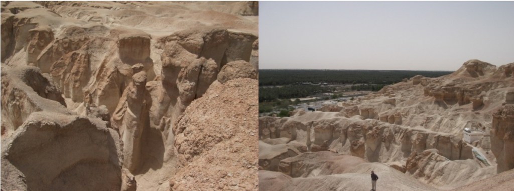 Al-Hasa Oasis has the characteristic side-hole cave located in the sandstone hill near 10km east of Hofuf. A vast date palm garden spreads all over the foothills. These side-hole caves might be the process that rain-fall erodes sandstone layers, creating a number of mushroom-shaped rocks, connecting them, and making a valley. Another factor is the presence of evaporative rocks. Evaporative rock is composed of rock salt, gypsum, aragonite, etc., and is part of a sandstone layer like a sandwich. There are the places where a part of them had been dissolved in water and made an empty space. This also promotes cave formation.