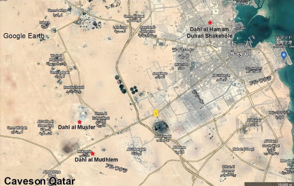 カタール半島は、全体がkarst地形で形成されていますが、横穴洞窟はなく、陥没穴洞窟に限られています。全土的に知られるような洞窟は、3ヵ所あります。それ以外の陥没孔(sinkhole or doline)は、風で運ばれる砂塵で埋められたり、入り口が崩壊したりした小規模なものに限られているようです。アラビア楯状地(Arabian Shield)を取りまく、石灰岩層を大規模に含む堆積層帯の外周部なので、海底洞窟を含めて今後、発見される可能性はあると思います。
