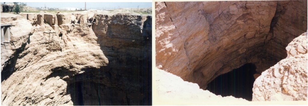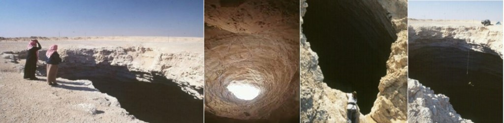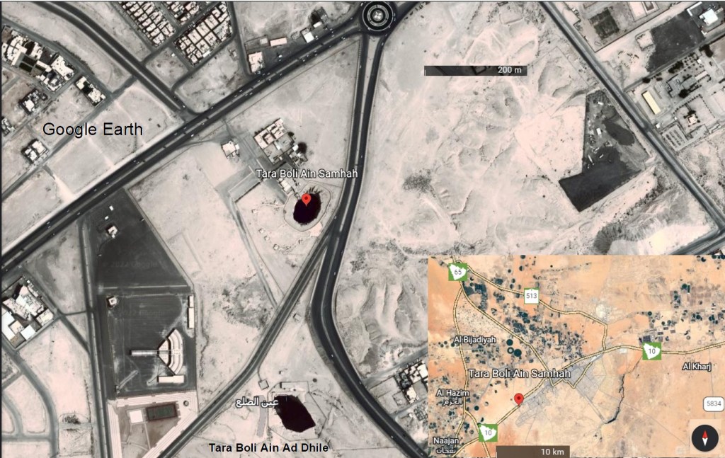 ハルジュ(Kharj)に大きな隕石が落ちて出来た垂直洞窟(Vertical Cave)があるとの話を聞いて、筆者は、1996年2月27日にそこを訪ねました。畑の奥に1930年にアラムコ(ARAMCO)がこの地域の灌漑用水汲み上げの為に設置し、今日も使われている水汲み用のポンプ小屋があります。その裏側に直径50メートルを超え、覗き込んでも底が見えないような巨大な竪穴(Crater)があり、そこに入れたホースで水を汲み上げていました。底が見えないので、その竪穴の縁まで行って覗き込むと、遥か下に黒く水面が見えました。陥没穴洞窟は、南に500メートル離れてた場所にも一つあります。現地の人達には「数千前に落下して来た隕石が穿った穴だ。」と語り継がれ、地球の隙間を意味する「目(عيون)」として知られています。それぞれにアインサムハ(Ain Samha) (عين سمحة)およびアインディラ(Ain of al-Dila)(عين الضلع)と名付けられていましいた。Ayuun as Seehや Ayuun an Najm等、他にも呼び方が幾つかあり、星が作ったロマンとは程遠いですが、正式にはTara Boli Ain Samhah and Tara Boli Ain Ad Dhileと定められました。