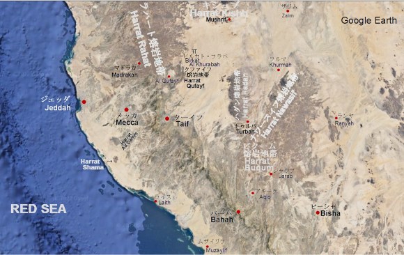 アラビア半島の基盤は、その形成の核となったアラビア楯状地(火成岩地帯)とその後に形成され、その上に積もった石灰岩を主とする堆積地帯とから出来ています。現在は、麦わら帽子を半割にした様に紅海を底としてその東側に凸型をして膨らむような形に残されているアラビア楯状地の地上に現われている部分をその約2倍の幅で堆積岩地帯が囲っています。