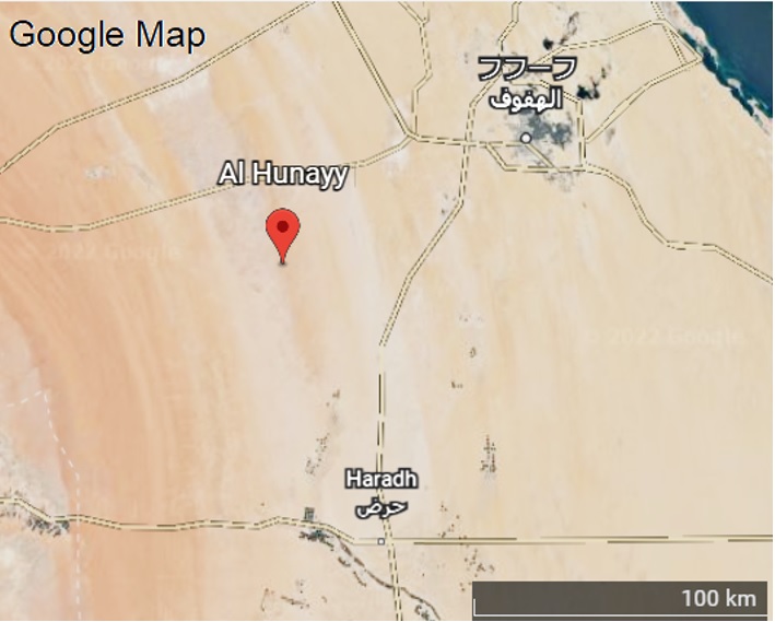 Mr. Leblings and Mr. Qurian Al-Hajri, who work on Aramco’s wildcatter, wrote that there is also “the place of the fallen star” near the Ghawar Oil Field, and he offered to guide Dr. Jon Pint there. Positionally, Dr. Jon Pint’s description tells us that it is near the Al Hunnay settlement north of Haradh.
