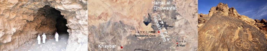 ハイル地方の南西にある熔岩トンネル(Lava Tunnel)、シュワイミス(Shuwaimis Cave)(530メートル)は、ナワーシフ・ビクーム熔岩地帯(Harrat Nawasif- Buqum)のハバシ洞窟(Habashi Cave)(581メートル)とハイバル熔岩地帯(Harrat Khaybar )のウンム・ジャルサン洞窟(Umm Jirsan Cave)(1,500メートル)に次ぐ長さです。シュワイミス洞窟(Shuwaimis Cave)は、ハーイル州(Al Ḥa’il Province)のハーイト(Al Hait)(الحايط)の西北西40キロ付近で、フタイム熔岩地帯(Harrat Hutaym)にあるカドラ火山(Khadraa Volcano)山腹にあります。横穴洞窟であり、その開口部は、高さは11メートル、幅は16メートルあります。出入りが比較的容易で、内部にはアーチ型のホールがあり、洞窟内は温暖で、真ん中に小さな降雨通路があり、通気口にも成っています。この様な条件がサウジ観光国家遺産委員会(the Saudi Commission for Tourism and National Heritage (SCTH))が観光地化を検討している理由だと、思われます。