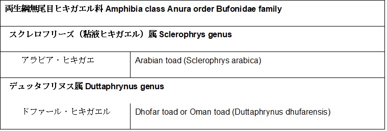 両生類としてアラビア・ヒキガエルやドファール・ヒキガエルが挙げられます。アラビア半島で発見された9種の両生類の内の2種で、この2種はいずれもアラビア半島の固有種です。
