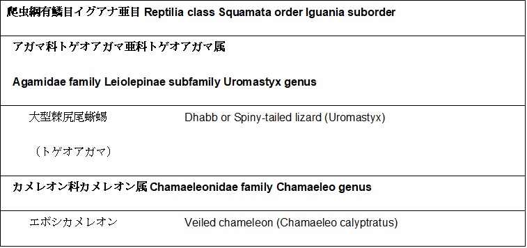 トカゲ類の代表はダッブと呼ばれる有鱗目アガマ科(キノボリトカゲ科)トゲオアガマ属大型棘尻尾蜥蜴です。また、エボシカメレオン等のカメレオン科も見られます。