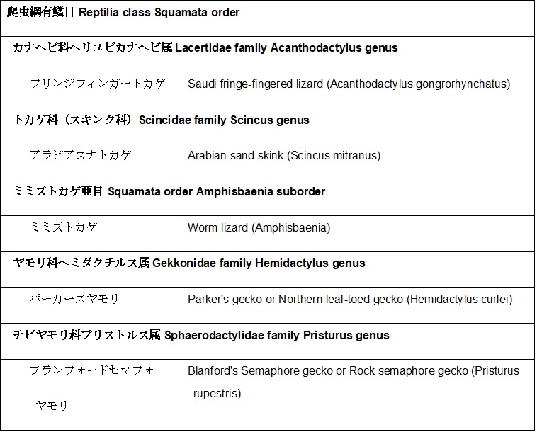 爬虫類は特にトカゲの数が多く、代表的なトカゲとしては、フリンジフィンガートカゲ、アラビアスナトカゲ、ミミズトカゲ等が生息しています。パーカーズヤモリやセマフォヤモリ等のヤモリの類も少なくありません。