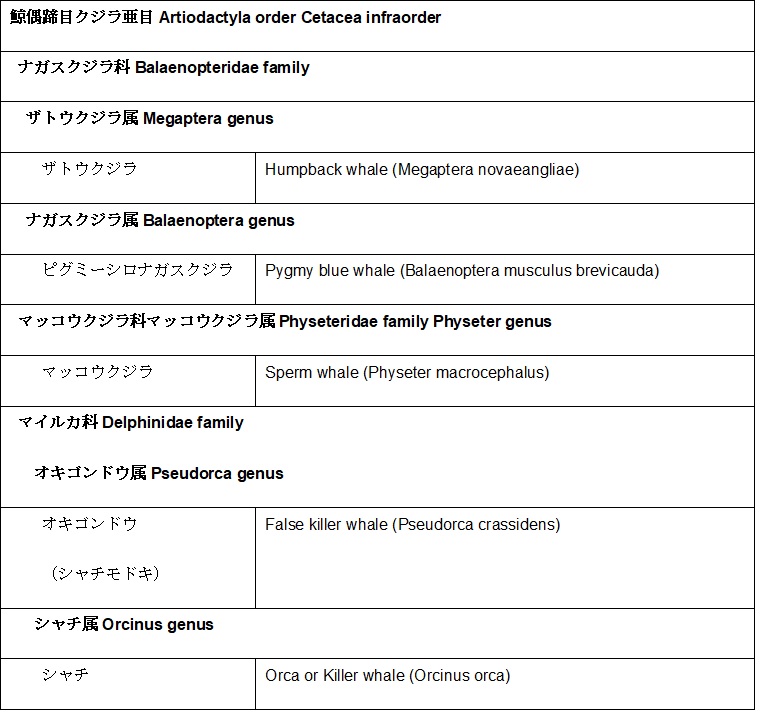 クジラ類としては、ザトウクジラ、ピグミーシロナガスクジラ、マッコウクジラ、オキゴンドウ(シャチモドキ)、シャチ等が挙げられます。