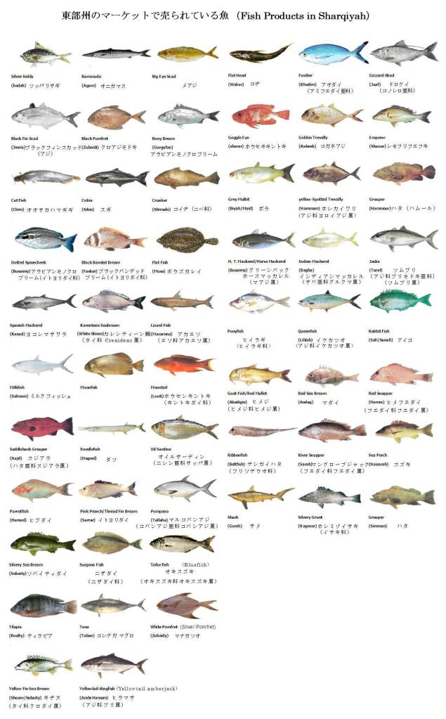 海の魚介類 (Fish and shellfish)の種類は余りに多く、ここでは割愛しますのでhttp://saudinomad.karuizawa.ne.jp/gulffishes.htmlをご参照ください。