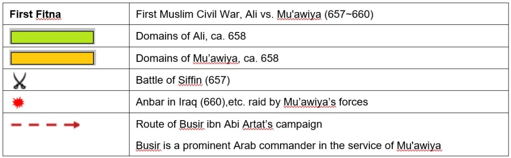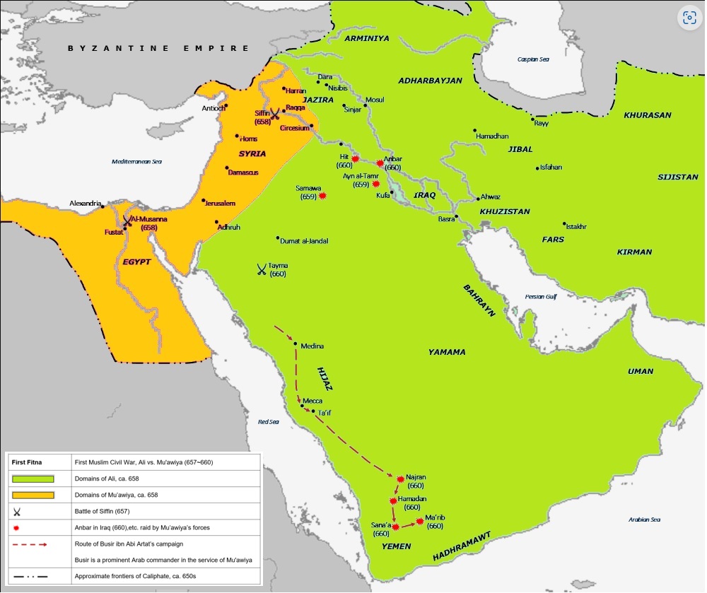 その後、現職のシリア総督ムアーウィヤ(Mu’awiya ibn Abu Sufyan ibn Harb ibn Umayyah)は、ウスマーンの死に復讐するために、表面上はアリーに宣戦布告しました。両者は 657年7月にスィッフィーンの戦い(Battle of Siffin)で対決しましたが、膠着状態と仲裁に終わりました。