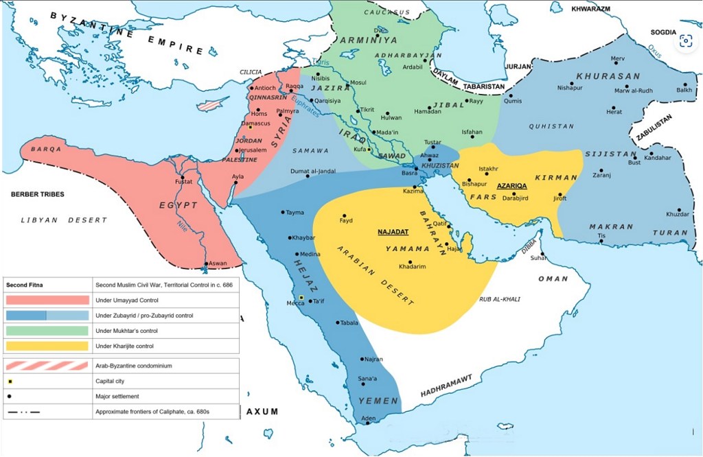 イブン・スラド(Sulayman ibn Surad)の悔い改め運動(Penitents movement)に始まり、フサイン(Husayn ibn Ali)の死に対する復讐を要求する一連の親アリード運動(pro-Alid movements)は、クーファで出現しましたが、685年1月のアイン・ワルダの戦い(Battle of Ayn al-Warda)でウマイヤ朝(Umayyad Caliphate)によって鎮圧されました。その後、クーファはムフタール(Mukhtar al-Thaqafi)に引き継がれました。彼の軍隊は 686年8月のハジールの戦い(Battle of Khazir)で大規模なウマイヤ朝軍を敗走させましたが、ムフタールと彼の支持者は一連の戦いの後、687年 4月にズバイル朝(Zubayrids)によって殺害されました。アブドゥルマリク(Abd al-Malik)の指導の下、ウマイヤ朝(Umayyad Caliphate)はイラクのマスキンの戦い(Battle of Maskin)でズバイル朝(Zubayrids)を打ち負かし、692年のメッカ包囲戦(Siege of Mecca)でイブン・ズバイル(Ibn al-Zubayr)を殺害した後、カリフ制の支配を再主張しました。