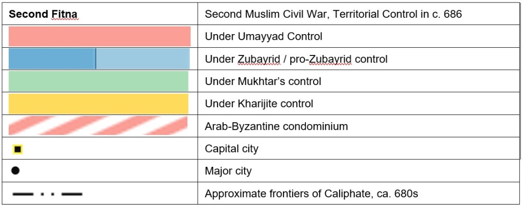 | 第二次ムスリム内戦 (Second Fitna) | ウマイヤ朝(Umayyads)とイブン・ズバイル(Abd Allah ibn al-Zubayr)の間の内乱 (680/683~685/692) |
