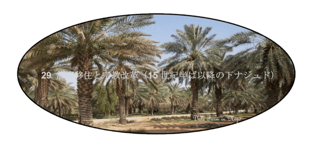 The settlement of the Lower Najd had gradually been revived as the improvements in environmental conditions from the mid-15th century to the early 17th century. This revival might be stimulated by the invasion of Jabrids (1417~1524) (الإمارة الجبرية) to Yamamah (يمامة) and Arid (عريض). It’s also be done by the prosperity of the Arabian Gulf trade under the hegemony of Kingdom of Hormuz (10th~17th C) (مملكة هرمز) from 14th century to 15th century (see chapter 28).