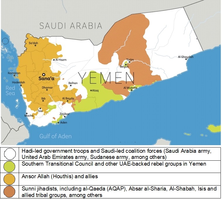Yemeni Civil Warr is the battle between the Houthis (حوثيون) and the forces loyal to the former president Ali Abdullah Saleh (علي عبد الله صال). The Houthis (حوثيون) of the Shia Islam (شيعة) overthrew the Abdrabbuh Mansur Hadi (عبد ربه منصور هادي) regime of Sana’a (صنعاء) in September 2014 and during the following months the Houthis seized the control of the other several Yemeni regions. Meanwhile, Ali Abdullah Saleh was exiled in the 2011 riots sparked by the Arab Spring (الربيع العربي). His successor, President Abd Rabbo Mansur Hadi, was held captive in Sana’a but escaped on his own to Aden (عدن) and declared to resume to his presidency.