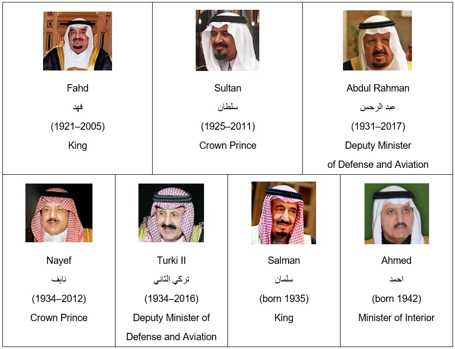 アブドゥルアズィーズ国王(King Abdulaziz) (عبد العزيز آل سعود)とフッサ・ビント・アハメド・アル・スダイリ(Hussa bint Ahmed Al Sudairi) (حصة بنت أحمد بن محمد السديري)の間に生まれた7人の息子とその系譜です。最年長のファハド(Fahd) (فهد بن)が国王となってから、スルターン(Sultan) (سلطان)とナーイフ(Nayef) (نايف)が皇太子になるなど、勢力を固め、サルマーン(Salman) (سلمان بن)が2012年に皇太子となり、2015年に国王となりました。