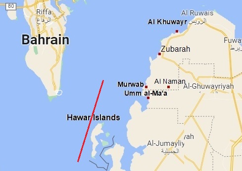 バハレイン(Bahrain)は、1936年に両国を含む島々のグループに対する支配を主張しました。最大の島は、バハレイン(Bahrain)人が小さな軍事駐屯地を設営していたカタールの西海岸沖に位置するハワール諸島(Hawar Islands) (جزر حوار)でした。英国は、主にバハレイン(Bahrain)のシャイフ(Shaykh) (الشيخ)の個人的な英国顧問が英国当局に馴染みのある法的な方法で自分達の主張を表現できたため、アブドゥッラー・ビン・ジャーシム(Abdullah bin Jassim)の異議に対するハレイン(Bahrain)の主張を英国は、受け入れました。