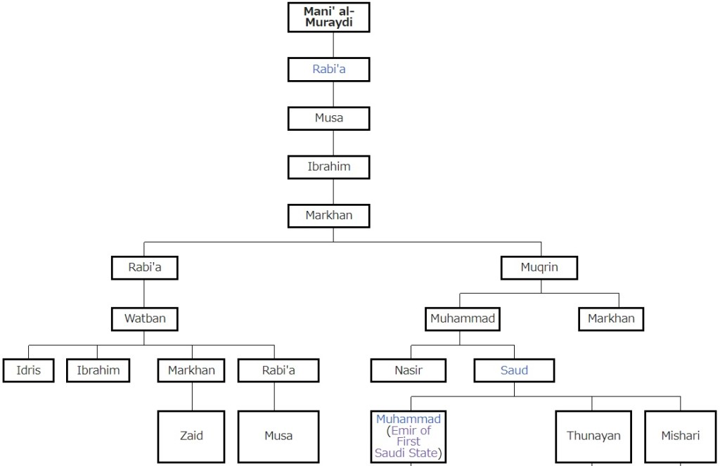 ムダイリス一門(Al Mudayris Clan) (لمديرس)も18世紀リヤードに残っていたアドナーン部族(Adnan Arabs) (العرب العدنانية)ラビーア族(Rabi’ah Tribe) (ربيعة)の支族バクル・イブン・ワーイル族(Bakr ibn Wa’il Tribe) (بكر بن وائل)のバヌー・ハニーファ一門(Banu Hanifa Clan) (بنو حنيفة) の末裔です。