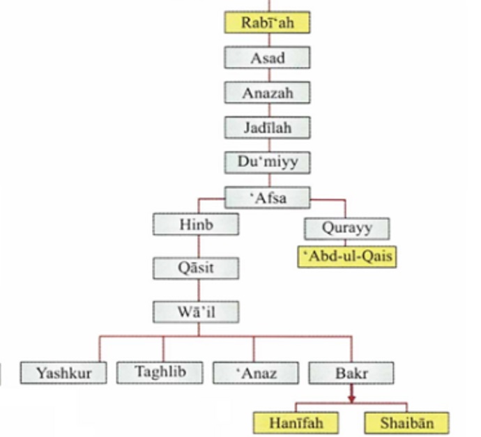 Branches of Rabi’ah Tribe include ‘Anazah Tribe (عنزة), Taghlib Tribe (بنو تغلب) (Taghlib ibn Wa’il Tribe (تغلب بن وائل)), Bakr Tribe (بكر) (Bakr ibn Wa’il Tribe (عبد القيس)) and Abdul Qays Tribe (عبد القيس). Bakr ibn Wa’il Tribe includes Banu Hanifa Clan (بنو حنيفة).