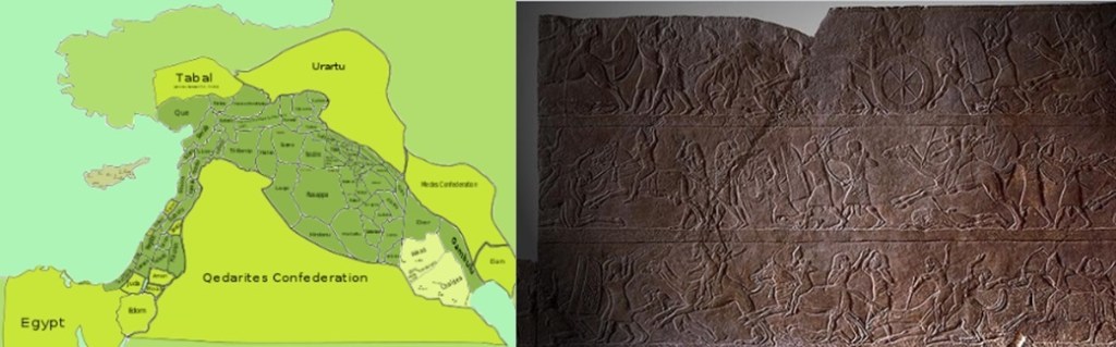 Territory of Qedar Confederation, and Assyrian reliefs depicting Battle between Assyria and Qedar tribes