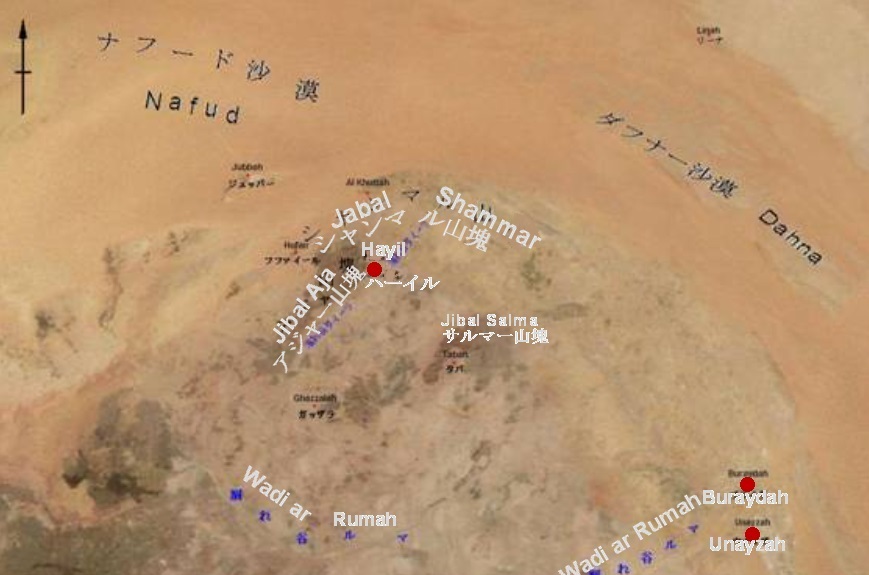 シャンマル族同盟(Shammar Confederation) (تحالف شمر)もハルブ族同盟(Harb Confederation) (تحالف حرب)と共にナジュド4部族(4 Najd Tribes)の一つです。ナフード沙漠(Nafud Desert) (صحراء النفود الكبير)の南端を先祖の故郷としています。