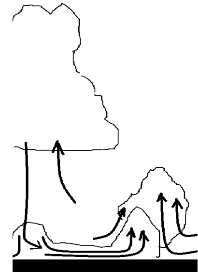 地形やその他の地域的な理由で、大気中に暖かい空気が下になり、冷たい空気が上になるような不安定な状態が表れることがあります。そのような場合は、地上の暖かい空気が砂や砂塵を浮遊させた状態で、周囲の空気を集めて上昇気流を作り出します(雷雲(thunderstorm)の形成)。