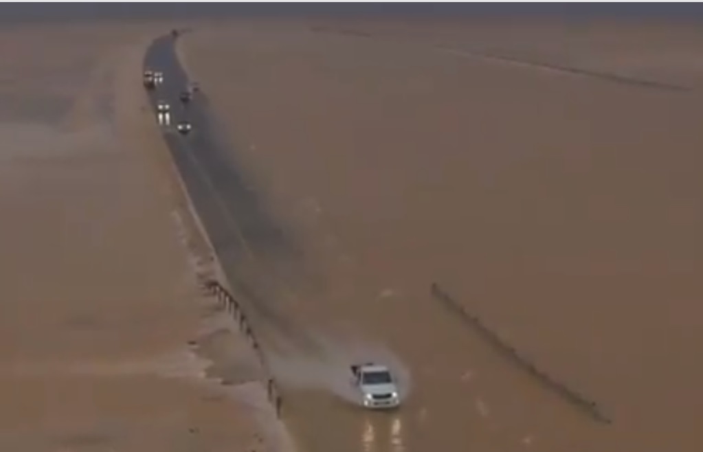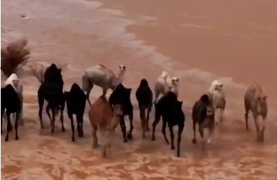 Khurmah is located 180km east-northeast of Taif. The Wadi Subay’ collects water from the ridge between Ta’if and Bahah in the northeast slopes of the Sarawat Mountains. It flows to northeast to Khurmah, turn east there and flows into the Subay’ Dunes Area. On April 21, 2021, the rain that had been falling since the previous week caused floodings in some provinces and brought snow fallings in the Ha’il and Asir regions. Fulma was also hit by flooding, and the images are part of a TV news channel reporting footage of a swarm of camels caught in it.