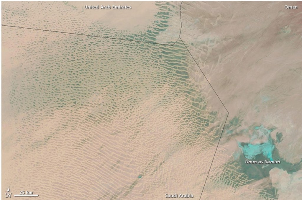 In mid to late April 2012, flooding occurred across the borders of Saudi Arabia, the United Arab Emirates and Oman. This is observed by MODIS aboard NASA’s Terra satellite. The range includes the southern Dafara region of the Lubua Hari desert, the Kidang and Leewa regions (from unm Samim). The flooded part is displayed in a blue-green hue.